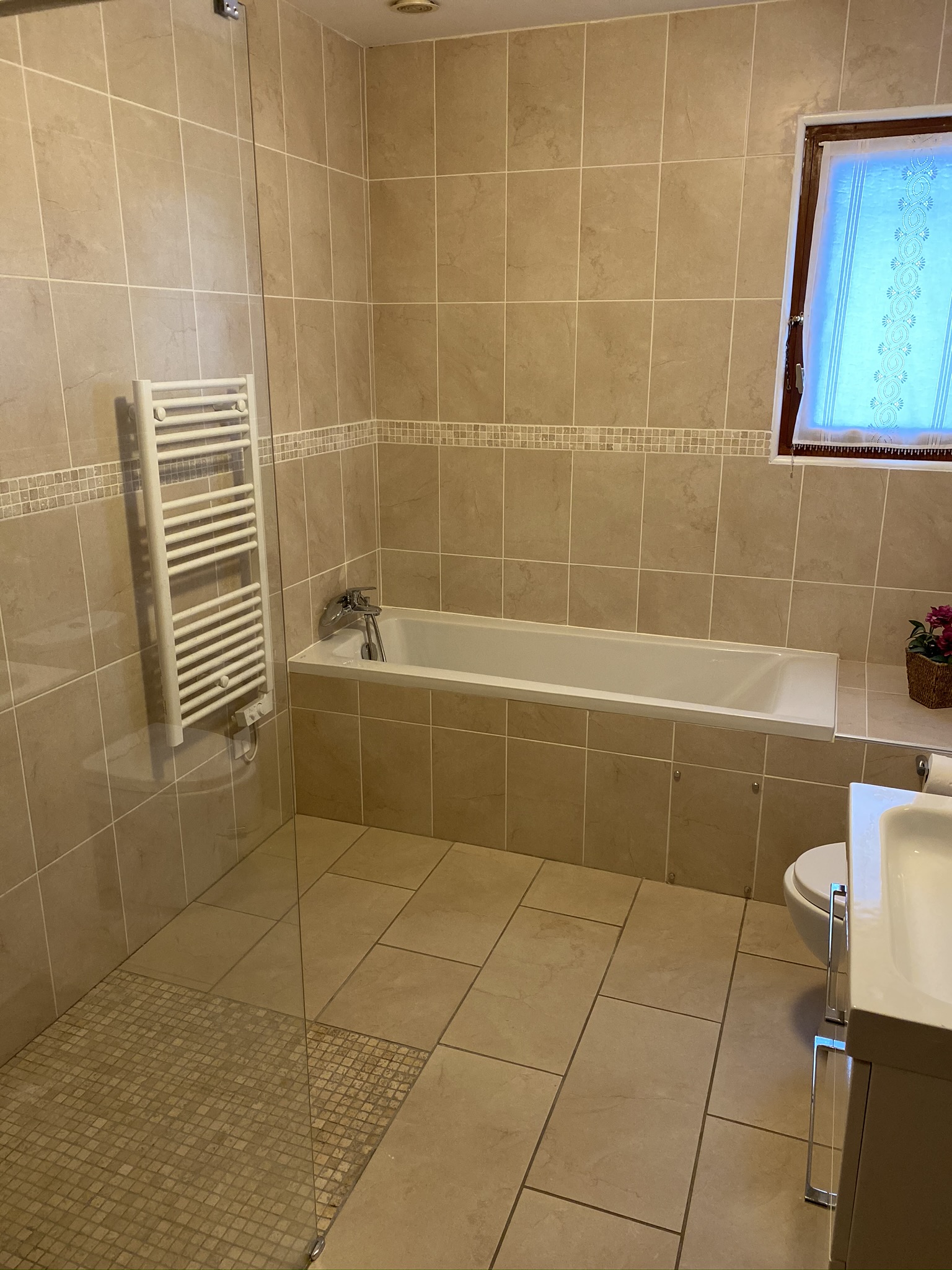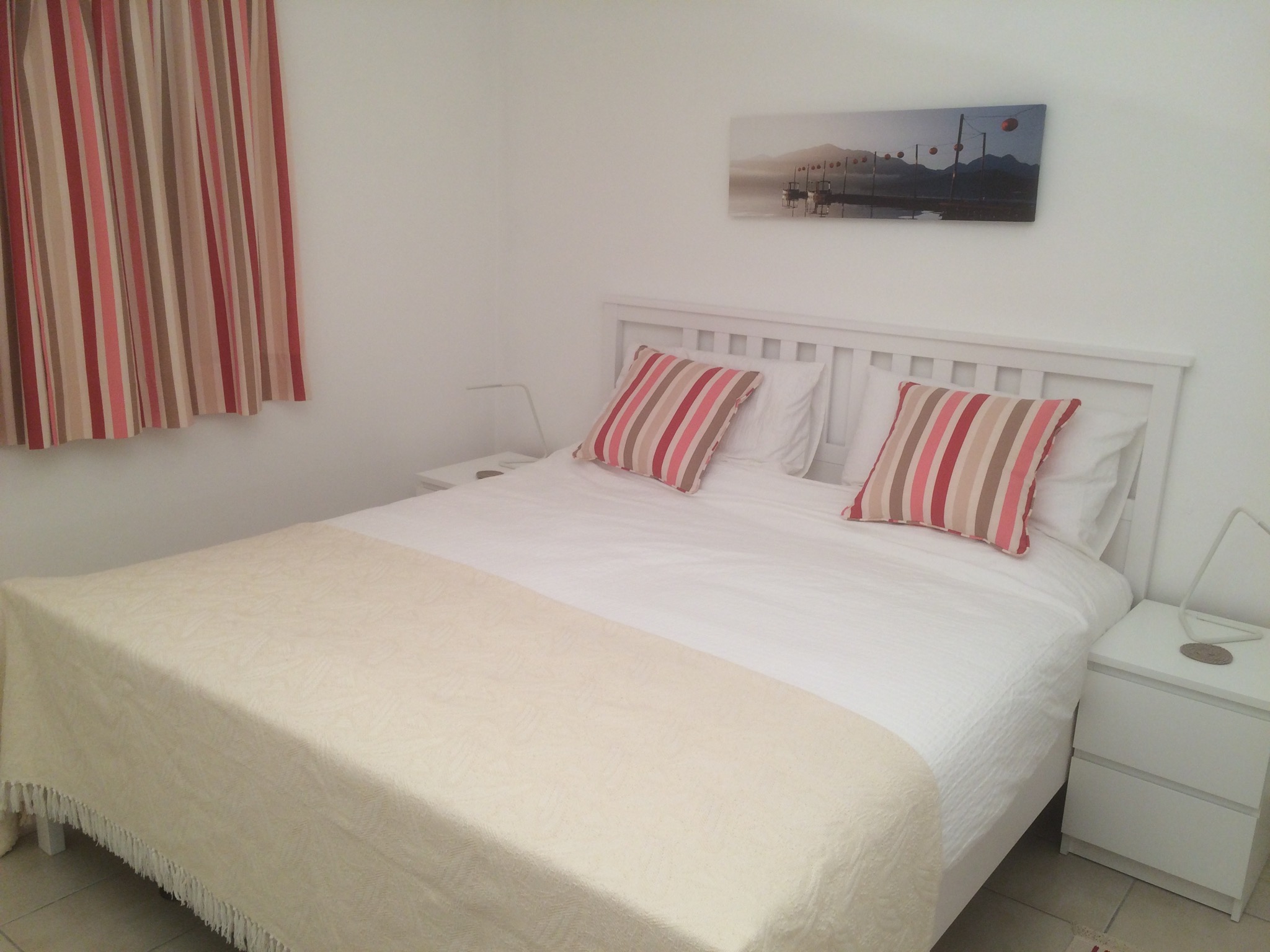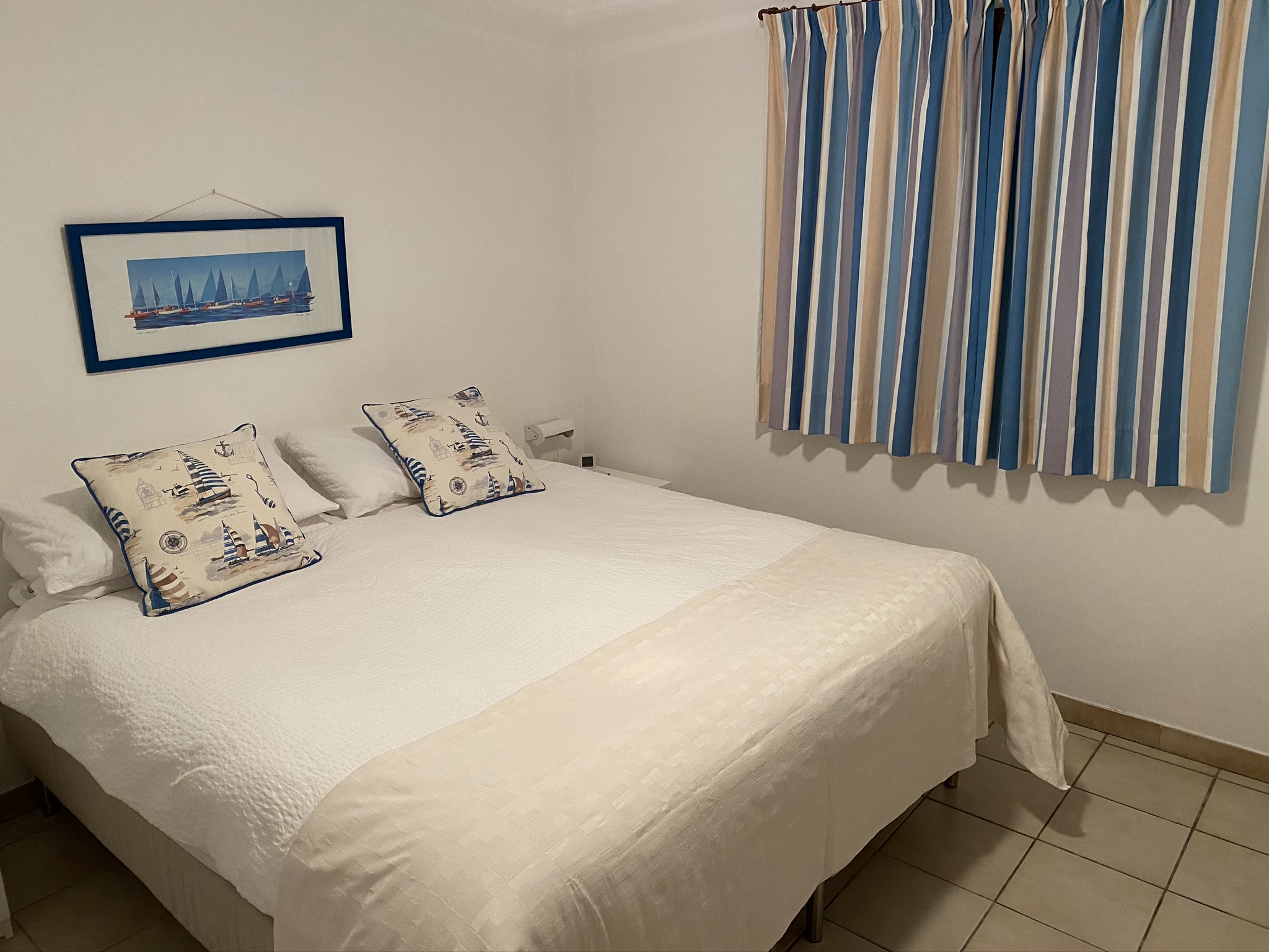 A door from the living area leads onto an inner hallway off which are the 3 bedrooms and the main bathroom. The main bedroom has a comfortable super-king size bed and has its own ensuite with shower, washbasin and toilet. Bedroom 2 is flexible as it can be offered as a twin room or with a king size bed. It also has useful washbasin. Bedroom 3 has twin beds. All bedrooms were refurbished in 2016 with new beds, furniture and soft furnishings.
